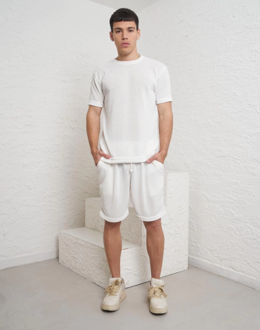 La bermuda ofrece un calce relajado y cómodo, perfecta para el día a día o momentos de descanso, mientras que la remera complementa el conjunto con un diseño versátil que se adapta a diversas siluetas sin perder su forma ni estilo.