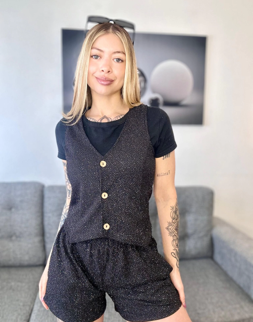 ✨ Brillá con estilo y comodidad con el Conjunto Hawai, confeccionado en tela Hawai con glitter que aporta un toque único y deslumbrante a tu look.
