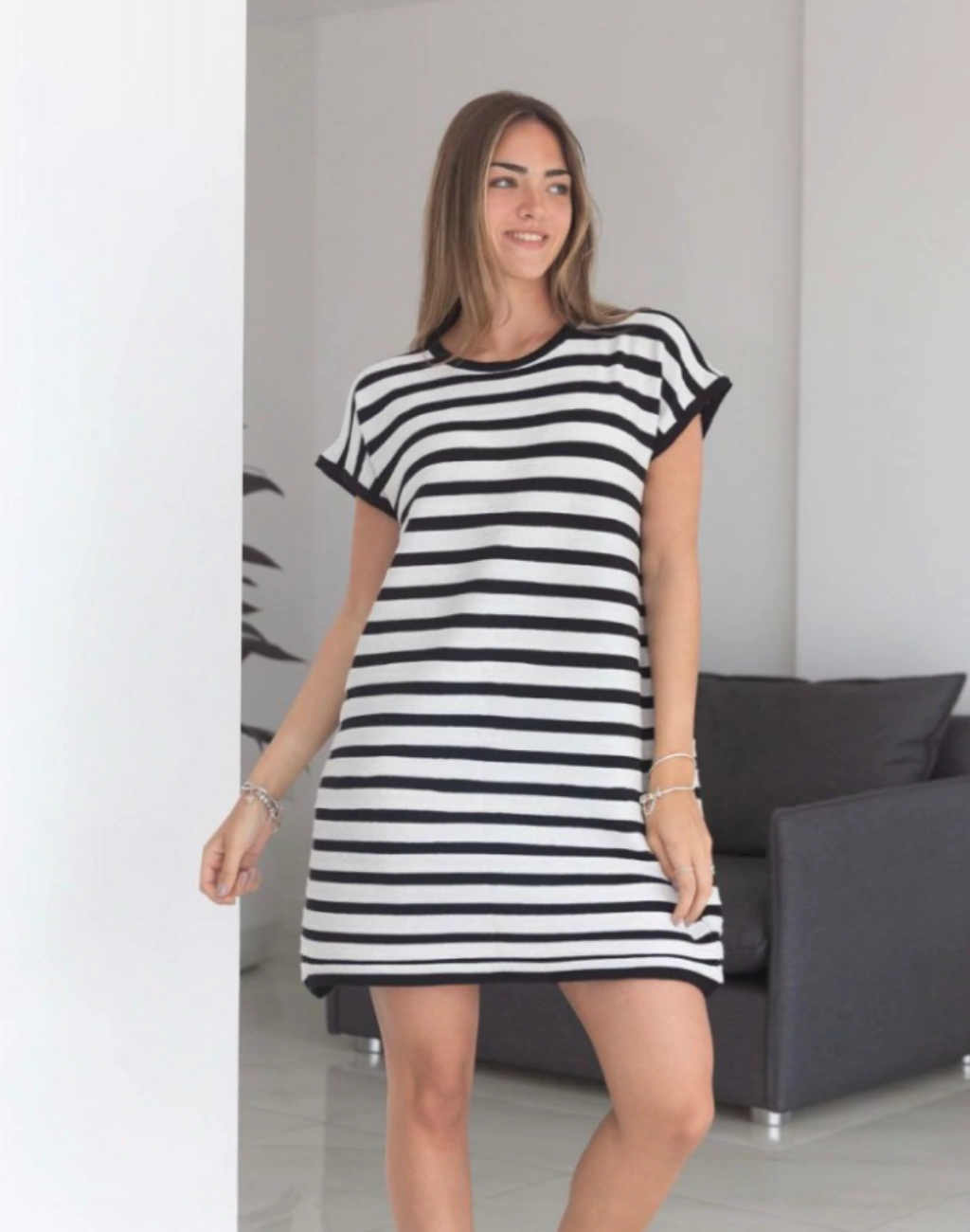 Descubrí el Vestido Rayado Lurex, confeccionado en tela hilo Bremer con lurex que aporta un brillo sutil y elegante. Este vestido, abarca hasta un 8, combina diseño y comodidad para que te sientas única en cada ocasión.